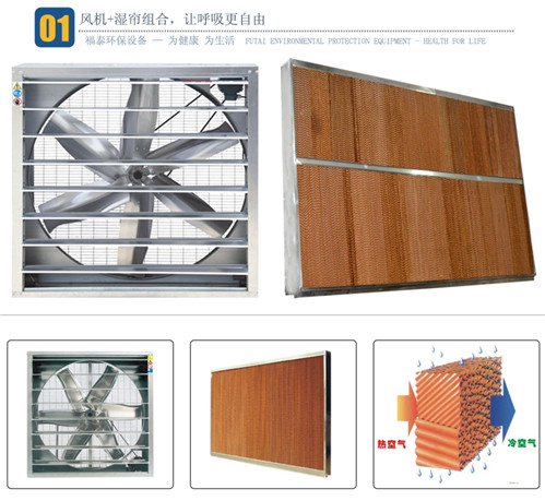 濕簾裝在密閉房舍一端山墻或側(cè)墻上,風(fēng)機(jī)裝在另一端山墻或側(cè)墻上,降溫風(fēng)機(jī)抽出室內(nèi)空氣,產(chǎn)生負(fù)壓迫使室外的空氣流經(jīng)多孔濕潤(rùn)濕簾表面時(shí),使空氣中大量熱量進(jìn)行轉(zhuǎn)化處理從而迫使進(jìn)入室內(nèi)的空氣降低10-15℃,并不斷的引入室內(nèi)進(jìn)行防暑降溫。